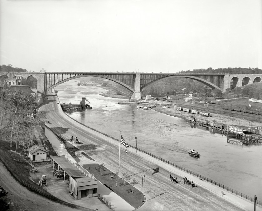 Below are two wonderful images from about 1905 that I found at Shorpy.com, an historical photo archive website. On the left is Highbridge Park and the Harlem River Speedway (the Harlem River Drive today) and dominating the center is the beautiful Washington Bridge. I love the carriages!